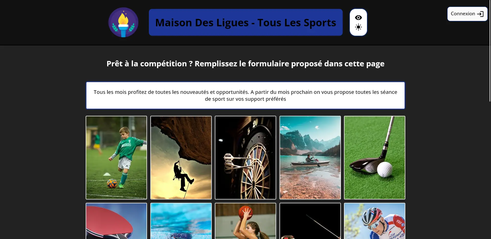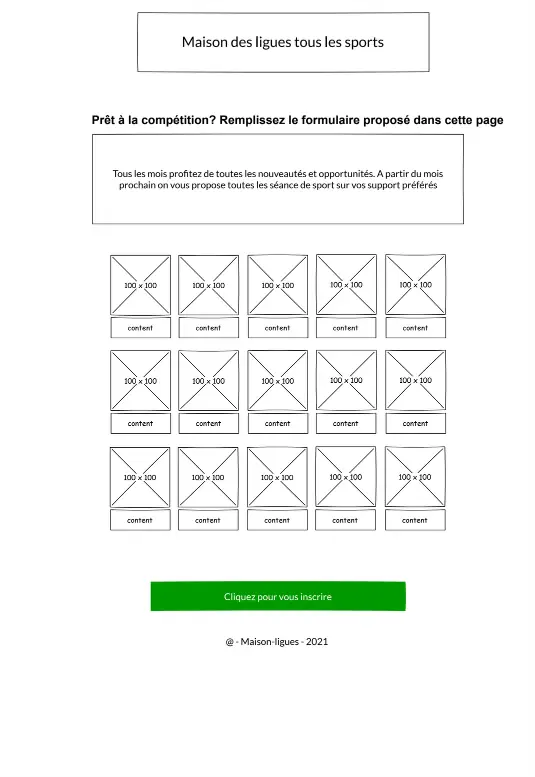 Une agence nous confie la réalisation d’une page publicitaire pour la Maison de ligues sur le web. La promotion a pour but de conquérir des nouveaux abonné(e)s, en proposant la diffusion de toutes les compétitions sportives. Pour cela nous conseille d’abord d’analyser toutes les fonctionnalités au travers des deux wireframes. Les spécifications pour le fonctionnement de chaque partie ne sont pas définies. La charte graphique doit être crée par vous.